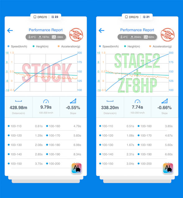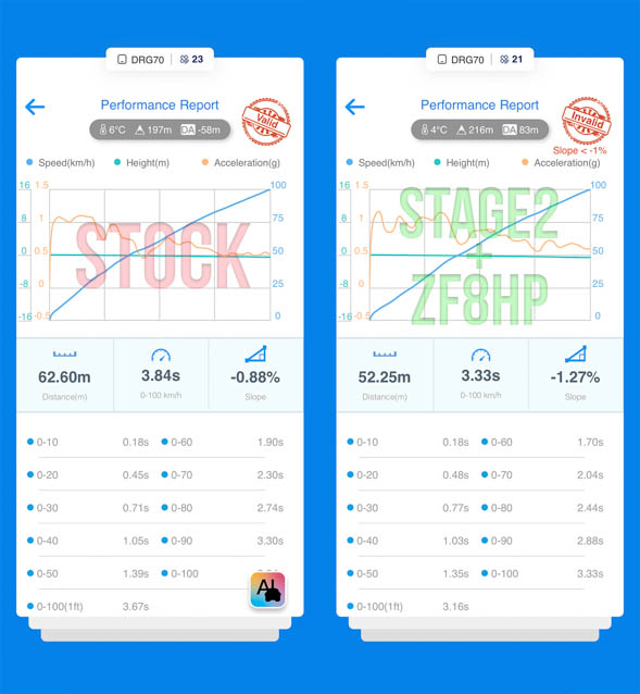 Разница Stock и Stage2+ZF8HP — 2,05 сек. 90,7 метра!